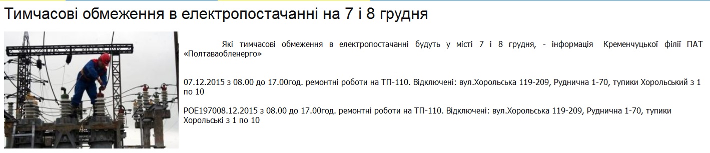 7 і 8 грудня через плановий ремонт електромереж у Кременчуці деякі райони міста будуть обмежені в електропостачанні